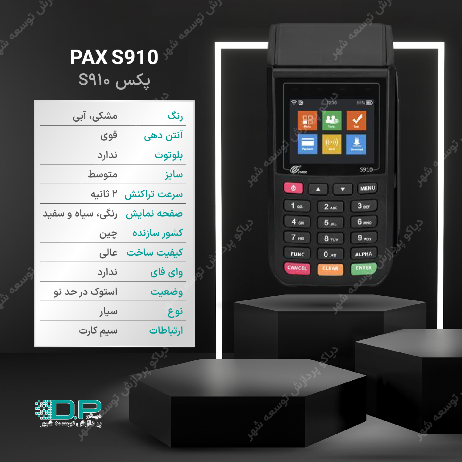 پکس اس 910 دارای 300 گرم وزن می باشد و به طور تقریبی می توان گفت که وزن به اندازه 200 گرم از سایر کارتخوان های موجود در بازار پایین تر است. پورت این محصول از نوع میکرو USB بوده و آکبند نبودن به عنوان تنها ایراد آن به حساب می آید. ولی باید به این واقعیت نیز اشاره کرد که بالای 90 درصد از کارتخوان هایی که امروزه در بازار به فروش می رسند ریفر شده و آکبند نمی باشند.شرکت دیاکو پردازش توسعه شهر سال های زیادی است که در زمینه عرضه و فروش انواع دستگاه کارتخوان ثابت و سیار از جمله  Pax S910 فعالیت دارد.